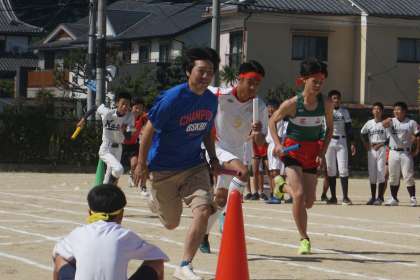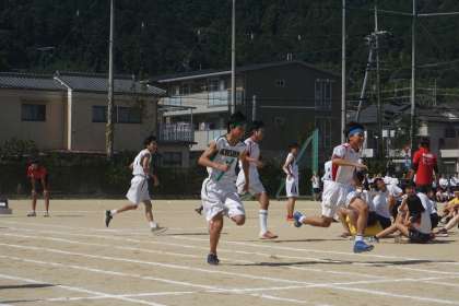 午前のラストは、「部活動対抗リレー」でした。それぞれの部活動のユニフォームなどを着用して走り、部活動の力を見せていました。先生たちも参加して、盛り上がりました!