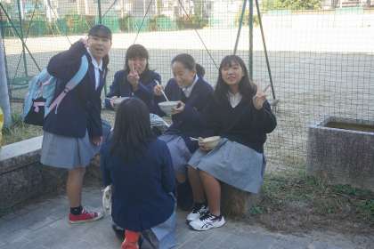 学校に戻ると、おいしい豚汁をいただきました。作り立てで栄養満点の豚汁でした。少し寒い日だったので、温かい豚汁をいただくことができて、良かったです。