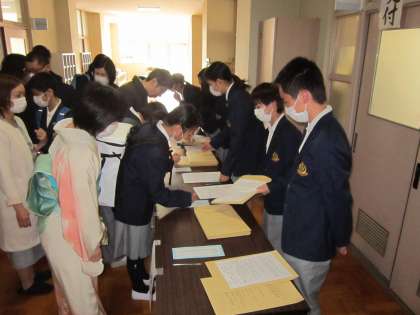 快晴のもと、待ちに待った入学式当日を迎えました。「人間は一生のうちに出逢うべき人間と必ず出逢える。しかも一瞬早すぎず、一瞬遅すぎない時に…」そんな言葉があります。花山中学校の門をくぐった今日という日の出逢い、それがこれからかけがえのないものになっていくと思います。そんな出逢いの日、まずはクラス発表が行われ、自分のクラス、名簿番号を確認しました。「同じクラスやん!」「違うクラスやん!」様々な思いの入り混じった歓声があちらこちらから上がっていました。