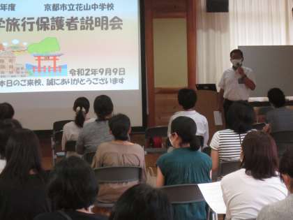 残暑に加え足元のお悪い中,多くの皆様にご出席いただきありがとうございます。来る9月22日から始まる修学旅行の詳しい説明は,校長先生の挨拶から始まりました。広島での平和学習,自然の中での体験学習などを通し,3年生集団の団結と親睦を深める3日間の行程です。健康面での説明も丁寧になされました。