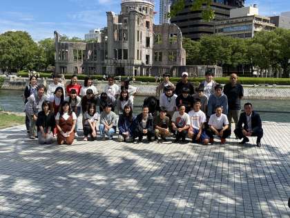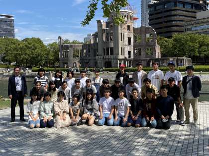 広島平和記念公園にて記念撮影。広島は晴れています。記念公園に入ってまっすぐ進むと,その向こうにこの建物は見えてきます。「原爆ドーム」。当時は「広島県産業奨励館」という名前でした。そして現在は世界遺産となっています。