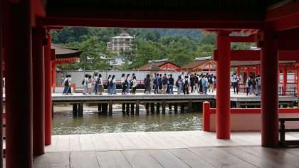 厳島(宮島)は、西日本の広島湾に浮かぶ小さな島で、森林や古い神社仏閣で知られています。沖合に立つ壮大な朱色の大鳥居へは、干潮時になると歩いて渡れます。