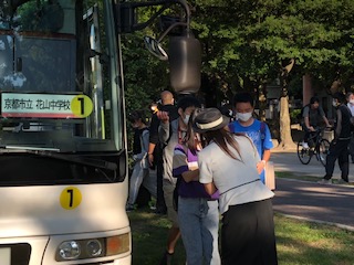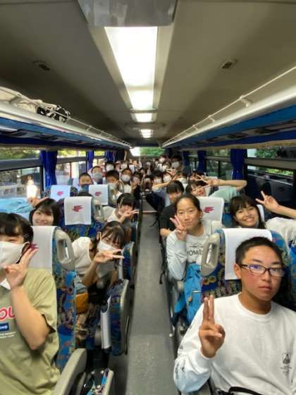 ホテル出発,バス乗車。乗車時には必ずアルコール消毒を行います。ここから約2時間,クレセントビーチを目指します。お天気は快晴,今日は広島の自然を体験し体感する1日です。