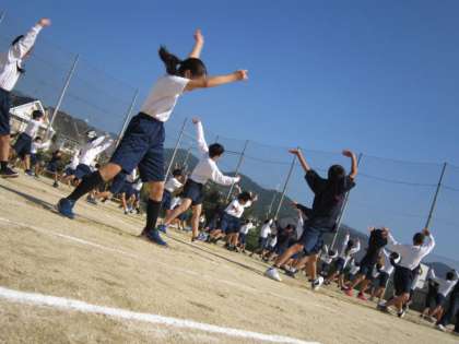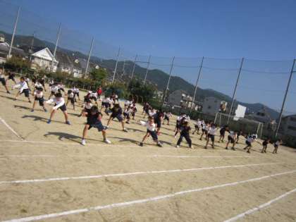 授業の後半はグランドにでました。さわやかな秋晴れのもと、まずは自分が踊るポジションの確認を行いました。一度、踊ってはみたものの、動きが鈍く、声も小さい。全くと言っていいほどの迫力のなさ…。当日まであと少しなのですが、課題が残る授業となりました。来週の月曜日、火曜日の授業が終われば、あとは当日。本番までが本番です。