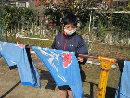 学校祭体育の部で1年生が使用した衣装の後片付けの後半戦です。1年生は他学年に比べて人数も多いため、2回に分けて行いました。今日は、6組のみなさんが前回同様、衣装を干してくれました。1回やっているので、手際もよく、前回の学びが活かされていました。衣装の色のような青空のもと、みんなで頑張りました。