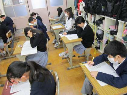 学習確認プログラムを行いました。「今、入試があるなら…」という気持ちで取り組めましたか。「1点に笑い、1点に泣く…」教師という仕事をやっていると、これに何度も出くわしてきました。1年生のみなさんには、2年後に笑顔になってほしいです。そのためには「努力」の2文字しかありません。2週間後は、第4回定期テストです。結果に貪欲になり、TSHK(正しい思考判断行動)をとって下さい。