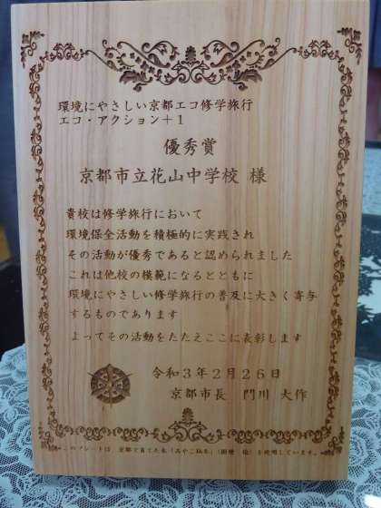 令和2年度 環境にやさしい「京都エコ修学旅行」優秀校に選ばれました。