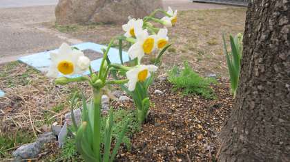1月上旬の寒い日に,PTA本部の方々が「スイセン・カモミール(カミツレ)・チューリップ」を植えていただきました。昨日より,スイセンが少しずつ,『小石で囲まれた“ハートマーク”の庭』に咲き始めています。春の足音が聞こえてきそうで、生徒も教職員も何だか嬉しい気持ちになりました。
