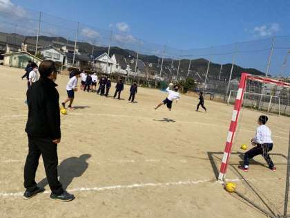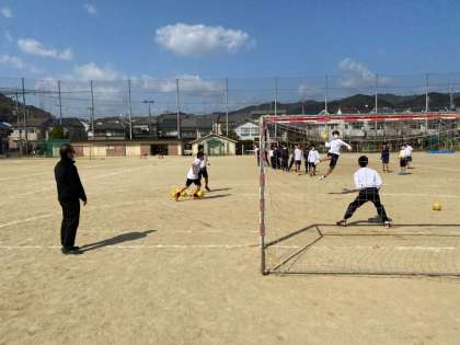 本校の教頭先生は、保健体育科であり、しかもハンドボールがご専門。選手としても指導者としても長期にわたって豊富な経験を積まれてきた方です。今日は、そんな教頭先生に「0123歩のジャンプシュート」を見てもらいました。全員が一生懸命取り組む姿にお褒めの言葉をいただきました。もっと専門的なことを教えてもらえるようになるまでもう少し時間がかかると思いますが、しっかり頑張っていきましょう。