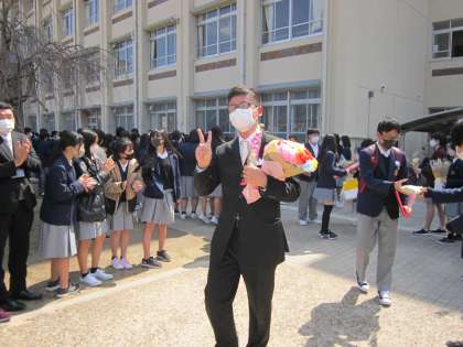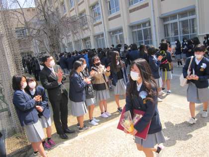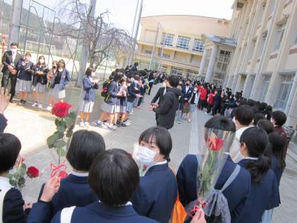 令和2年度第58回卒業証書授与式が挙行されました。1年生の生徒は残念ながら式に参列することはできませんでしたが、式後の花道づくりに部活動生徒中心に集まりました。卒業式を終えて出てくる3年生の生徒と並ぶと1年生はとても幼く見えますね。2年後には今日の3年生のような凛々しい姿になっているのでしょうか。楽しみでなりません。3年生のみなさん、3年間の中学校生活、そして9年間の義務教育生活の終了です。次のステージでも頑張ってくださいね。