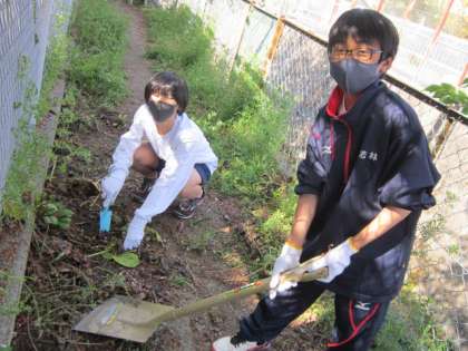 土おこし、畝づくりとともに、雑草抜きも頑張りました。まさに雑草魂。「どこからどんだけ生えんのや」「強いな〜」「抜けへん」とみんなが突っ込みたくなるその生え方と量。どれだけ時間があっても足りないくらいでした。しんどい作業なので、ネガティブな言葉も少し聞こえましたが、笑顔で楽しそうに頑張る姿が君たちの素晴らしいところですね。