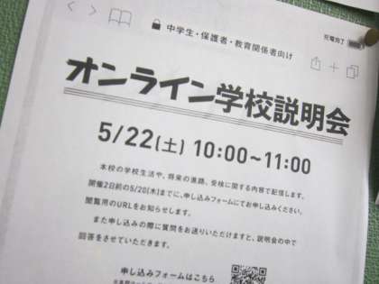 テストが終わり、少し一息ついているところでしょうか。1年生が終わろうとしている頃、進路意識を高めていくために、各クラス、高等学校のパンフレットを設置しました。2年生になり、継続して設置してもらっています。2年生になると、高等学校の見学会等の案内も少しずつ増えてきます。先日、はやくもオンラインの説明会への参加の意志を示してきた2年生の生徒が数名いました。褒めたくなるところですが、別に褒めることでもなく、普通のことです。2年生にもなれば、進路意識を高め、高等学校の情報収集をしたり、説明会参加等の具体的な行動に出始めることは当然のことです。受験生となる来年度の前年であるこの1年を充実させるのは君たち自身です。先生たちも一緒になって頑張ります。