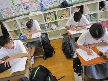 今日の道徳は、1学期の振り返りを行いました。1学期に取り組んだ内容のワークシートを眺めていると、たくさんの題材に一生懸命取り組んだことが伝わってきました。道徳は、各教科のように評定はつきません。しかし、日常生活のあらゆるところで道徳の学習の成果は問われると思います。例えば、2年生だけを見ていても、人の笑顔や御礼に貢献できる言動もあれば、人の怒りや悲しみ、そしてケガや事故等につながるような言動もあります。どちらがよりよい生き方なのでしょうか。今一度立ち止まって考えてみてほしいと思います。