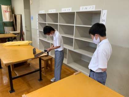 今日の技術の時間は、雨のため技術室で活動をしました。今は、木材をのこぎりで切って棚作りに取り組んでいます。のこぎりを使ってきれいに切るのは難しいですし根気がいります。みんな集中して取り組んでいました。3年生、2年生はさすが!って思うぐらいのこぎりを器用に扱い木を切っていました。1年生は先輩の姿をみて「すごっ!」と言っていました。来年には先輩のように切れるようになっているかな…。楽しみですね。