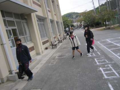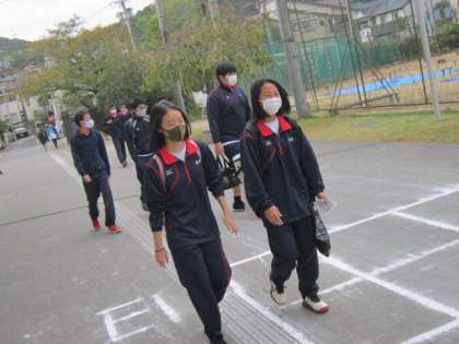 学校祭体育の部当日となりました。コロナ禍の今、開催も危ぶまれる中、何とか今日の日を迎えることができました。まずはそのことを喜んだ朝でした。まずは、朝の登校の様子です。行事の日の朝って何かワクワクしたり、ソワソワしたりすることが多いですね。気持ちが高ぶっている証拠です。今日は、そんな表情を浮かべながら、少し早めに登校している人が多く見受けられました。少し肌寒い朝となりましたが、熱い一日になる予感が花山中学校全体に漂っています。