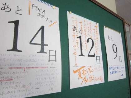 第4回定期テストが近づいています。範囲票等を配布した2週間前の日から、カウントダウンカレンダーを廊下に掲示しています。2年生の先生たちが「あと〇〇日」に加え、勉強方法等のアドバイスも記入しています。テストまでの残りの日に対し、9教科の学習内容を計画的にあてはめなければいけません。今回は、テスト範囲が少し広い教科が多いようです。自分を奮い立たせ、しっかりがんばってほしいと思います。