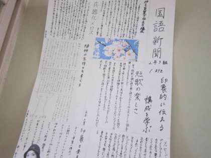 国語新聞という掲示物がありました。なんともダイレクトな名称の掲示物。クラス内でグループになり、一生懸命作っていることは聞いていましたが、どのようなものが完成するのか気になっていました。様々なテーマでたくさんの記事が書かれていましたが「何のために国語を学ぶのか」これが一番大事なテーマとして、書かれていました。今回、記事にしたことを、実践に移し、自分自身の力をっしっかり高めてほしいと思います。他のグループの新聞も読んでみてください。