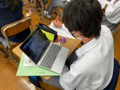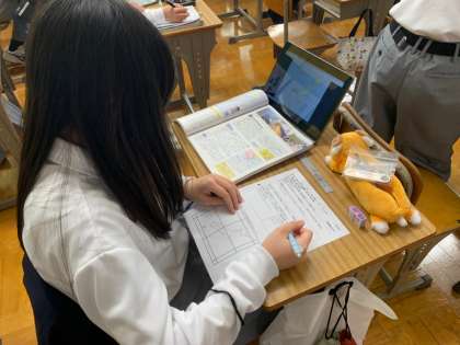 問いに対して,教科書で調べる,地図帳で調べる,タブレットで調べるなど,自分でどのツールがいいか選んで学習に向かっています。