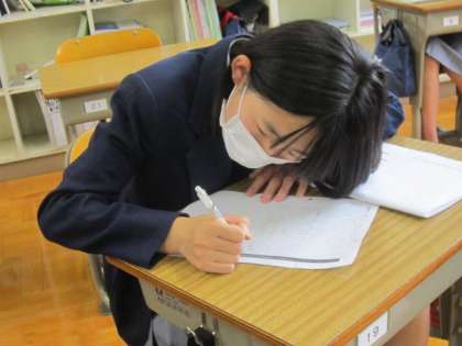 写真は保健分野の学習の様子です。何も保健分野の学習だけではありませんが、学習はインプットとアウトプットの両方が大事です。正しい知識や情報をしっかりとインプットし「知らなかった」を「知った」に変えること。そして、それをいかに使うか、どう使うかを意識しなければいけません。まずはインプットしたことを外に出せるかどうか、そのためには作文や発表が効果的です。どの教科でも、しっかり高めてください。