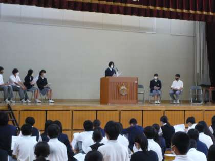 本日5時間目に生徒総会がありました。生徒会本部や評議・専門委員がこの日に向けて準備をしてくれました。議長の進行のもと,みんなの聞く姿勢もよく,スムーズに会を終えることが出来ました。「よりより学校作り」「みんなの学校作り」に向けての生徒総会。素晴らしい会となりました。