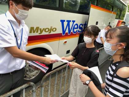 バスに乗る前に、タグを受け取り、荷物を載せます。朝の健康観察の結果を書いた紙を担任に提出しています。