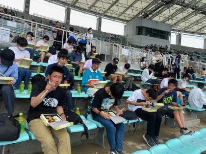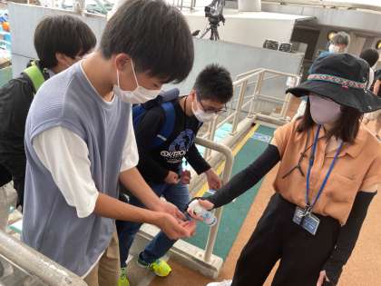 イルカパフォーマンスが終わり、昼食の時間です。素早く集まり、指示を聞く姿、素晴らしいです。アルコール消毒をして、ディスタンスを確保しながら昼食をとっています。
