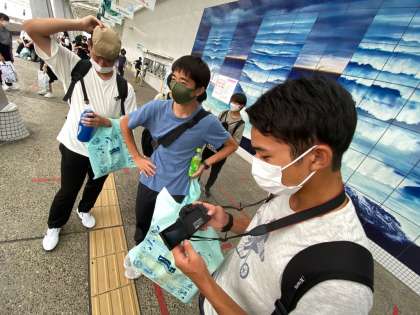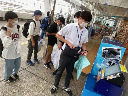 名古屋港水族館を出て、少しずつ集合場所に集まってきています。学習用タブレットで撮ったマイワシのトルネードの動画を見せてくれた生徒もいました。