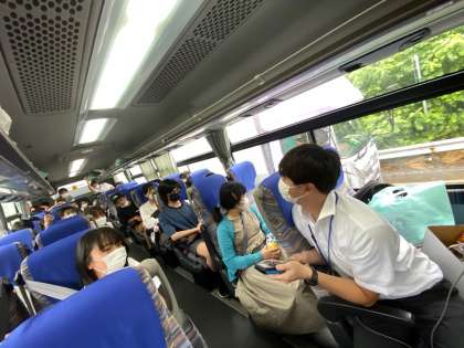 現在、中央道、星空のきれいな阿智村のあたりを走行中です。各クラス、状況に応じてトイレ休憩をとっています。少しの渋滞にあいながらではありますが、確実に山梨へと向かっています。バス内ではクラスによってはレクレーションも行われています。