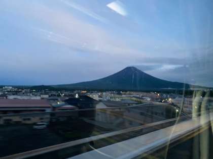 まもなく山中湖です。日の入り直前の富士山もしっかり見えています。こちらは完全に晴れています。バス内では富士山についてのレクチャーが行われています。