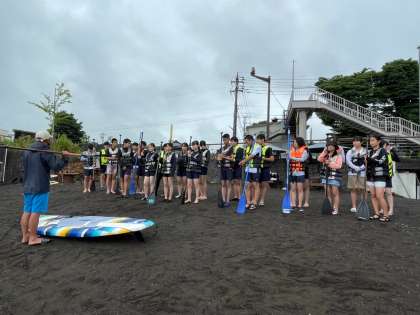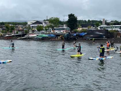 SUP体験の様子です。なかなか操作が難しいSUP。体幹部分をよく使い、大変疲労度も高いようです。琵琶湖でもやっているようなので、機会があれば帰ってからも挑戦してみてください。