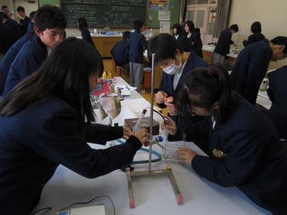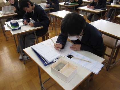 美術室では、1年生が自分の名前のレタリング、理科室では2年生が実験の授業です。皆、本当に熱心に取り組んでいました。