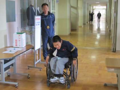 自立活動では、本校の長い廊下を車いすで往復する時間を測定しています。