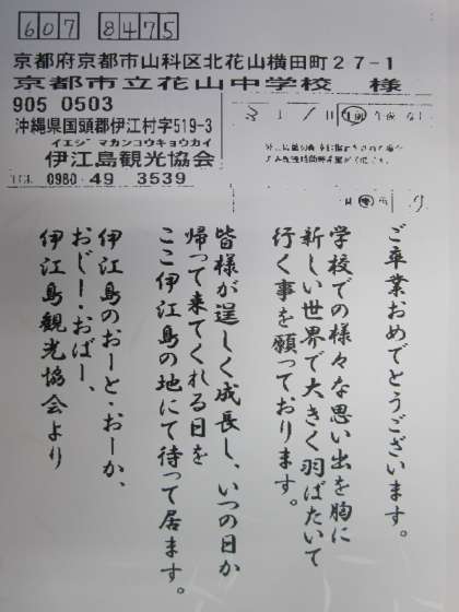 そんな中、昨年修学旅行で訪れた伊江島の皆さん方からお祝いの電報が届きました。また、学年の掲示板に貼ってもらいますが、一足早く披露します。