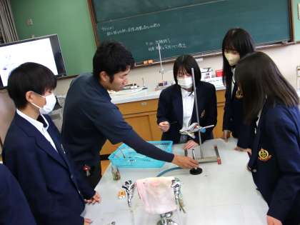 2年生理科の授業では酸化銀の熱分解の実験が行われていました。最近では使う機会の減ったマッチですが、2年生ともなるとマッチをはじめとする実験道具や器具の扱いも手慣れたものです。各自ができることを探し、声をかけ合いながら協力して取り組む姿が印象的でした。