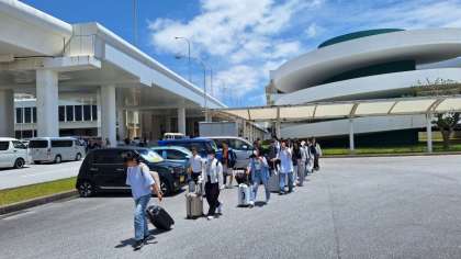 3年生が予定通り、那覇空港に到着しました。那覇市の気温は27度と、とてもいい天気です。この後、沖縄県最初の目的地へとバスで向かいます。