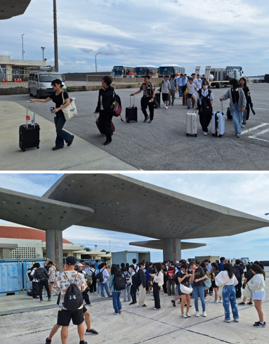 3年生が本部港に到着しました。到着したクラスから荷物をコンテナに積込みフェリーに乗る準備をしています。乗船前にこの後の確認を全員でします。