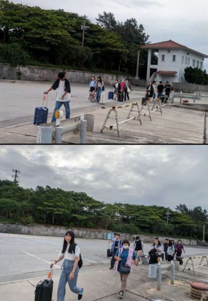 荷物を整理し、伊江島の民家さんの家をあとに、退村式会場へと向かっている様子です。