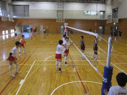 ちょうど今、下京中学校の生徒たちが一列に並んで本校の生徒たちに爽やかな挨拶をしたところです。