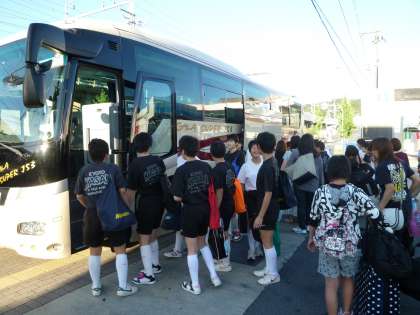東京での全国大会に向け,女子バレーボール部が元気に出発しました。早朝6時20分に五条通りMK前へ集合し,選手19名と10名の保護者応援団を乗せた観光バスが京都をあとにしました。今後の予定は14時30分頃に東京代々木第一体育館へ到着。16時から開会式に臨み,そのあと宿舎「YMCAアジア青少年センター」にはいります。
