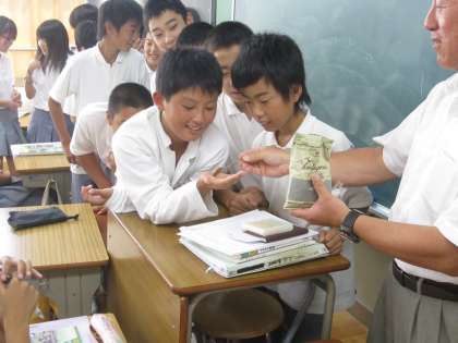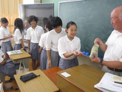流石に1年生。たくさんの人が名乗りをあげ、たちまち教卓の周りは人だかりができました。一口舐めてみて、「なになに?」「あー、分かった!」など口々に話していました。
