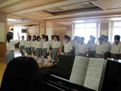 左)ピアノの伴奏に合わせて合唱練習に取り組む1年生。