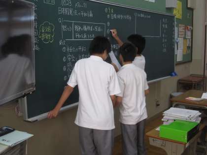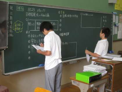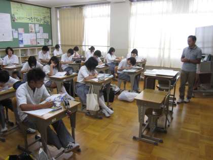 今日の授業の山場です。生徒が考えだしました。プリントに考えを書き込んでいきます。その間に、昨日2年生で言ったことと同じことをコメントさせてもらいました。