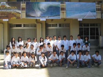 1年生が、出来上がったデジタル貼り絵の前で、集合写真を撮影していました。