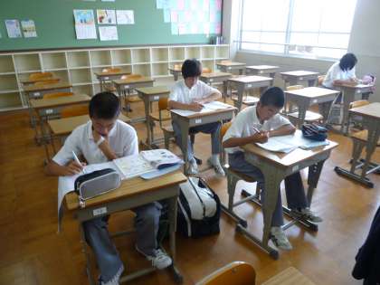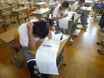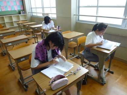 今日の午前,2年1組の教室で2年生の夏の学習会が開かれました。1時間目は理科でプリントの問題に取り組んでいました。なかなか難しそうでしたが,がんばっていました。