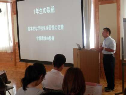 花山中は、研究主任の山口先生が研究全体について報告した後、各学年主任がそれぞれの学年の様子について発表しました。