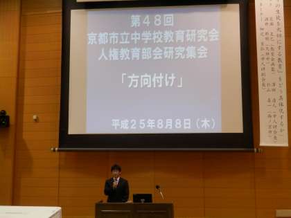 7月26日の「道徳教育研究大会」に始まり、30日には「コミュニティースクールの全国大会」、8月5日には「道徳教育の研修会」、そして8日には「京都市立中学校人権教育研究集会」と校外での研究会や研修会に相次いで参加しました。この間、校内でも森口健司先生をお招きしての「道徳・人権教育の研修」、鏡山小・陵ケ岡小と行った「三校合同研修」など、たくさん学ぶ場面や考える機会を得ました。教育公務員の特権で、私たちは勤務時間内にこうした研修会や研究会に参加することが許されています。一般企業なら、勤務時間外に受講料を支払って受けるような研修を給料をもらいながら受講できるのだから、内容をしっかりと聴き、豊かで確かな学びをしなければならないと若い頃に教わりました。