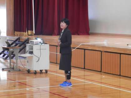 怪我のため、6月からお休みされていた大賀玲子先生が復帰されたので、全校生徒の前でご挨拶をして頂きました。