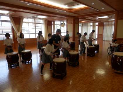 今年も生徒会本部の人たちが、育成学級生とコラボして太鼓の演奏で文化祭のオープニングを飾ります。その練習が時始まりました。今年は、1年生の太鼓好きな子もメンバーに入っています。