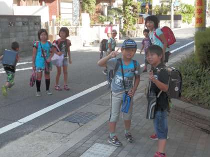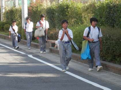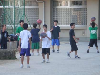 校門を入ったところでは、男子バスケット部の1年生が練習しています。それを見て小学性が「あっ、○○くんや!」と声に出していました。