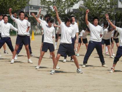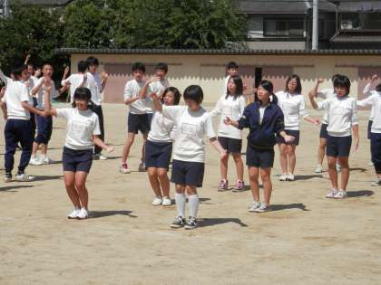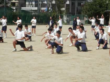 3年の体育の授業で、「京炎そでふれ!」の練習がグランドで行われるようになりました。